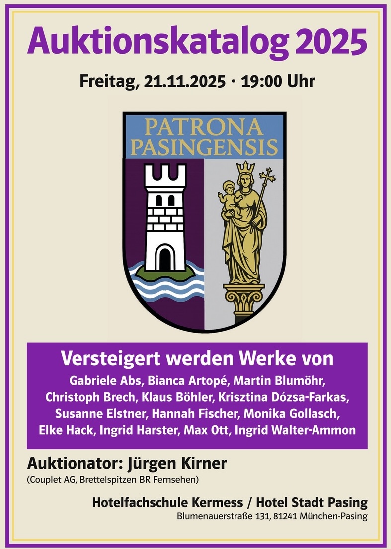 In diesem Jahr geht Pasing, bez. der Verein Pasinger Mariensäule e.V. (https://www.pasinger-mariensaeule.de/) als Ausrichter des Wildessens, neue Wege. Konzipiert ist eine Auktion, für die namhafte Künstler aus dem Münchner Westen Kunstwerke gespendet haben. Wer ist dabei? Kunstpreisträger und Künstler, die bereits im Rathaus Pasing ausgestellt haben, nämlich: Gabriele Abs, Bianca Artopé, Martin Blumöhr, Christoph Brech, Klaus Böhler, Krisztina Dozsa-Farkas, Susanne Elstner, Hannah Fischer, Monika Gollasch, Elke Hack, Ingrid Harster, Max Ott und Ingrid Walter-Ammon. Hier geht’s zum Katalog: http://www.familieeder.com/download/Auktionskatalog-Pasinger-Mariensaeule.pdf