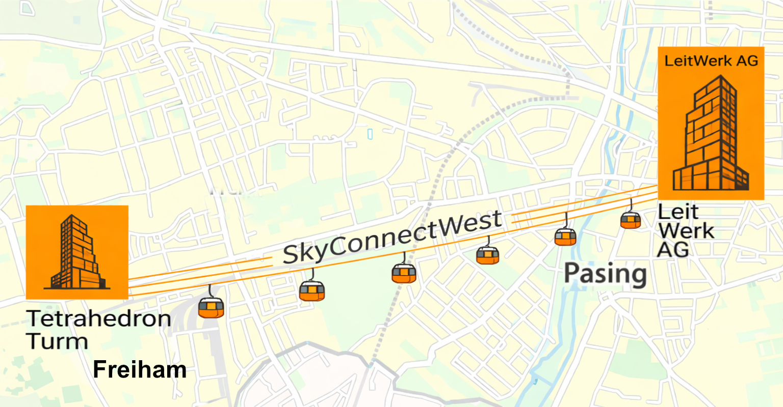 Vom Turm aus soll nun eine Seilbahn starten und über 7 oder 8 Stationen in 30 Metern Höhe bis zum vorläufigen Endpunkt in Freiham am Geothermie-Turm führen. In Kabinen mit Platz für 40 Fahrgäste und einem Abstand zwischen ihnen von 60 Sekunden könnten in der Stunde 2.200 Personen in eine Richtung transportieren, rechnete das Projekt begleitende Verkehrsplanungsbüro Robert Obermeier aus Gräfelfing vor und betonte: „Die Trassenführung nutzt bestehende Luftkorridore oberhalb der Landsberger Straße, wodurch Eingriffe in den Boden minimiert werden.“